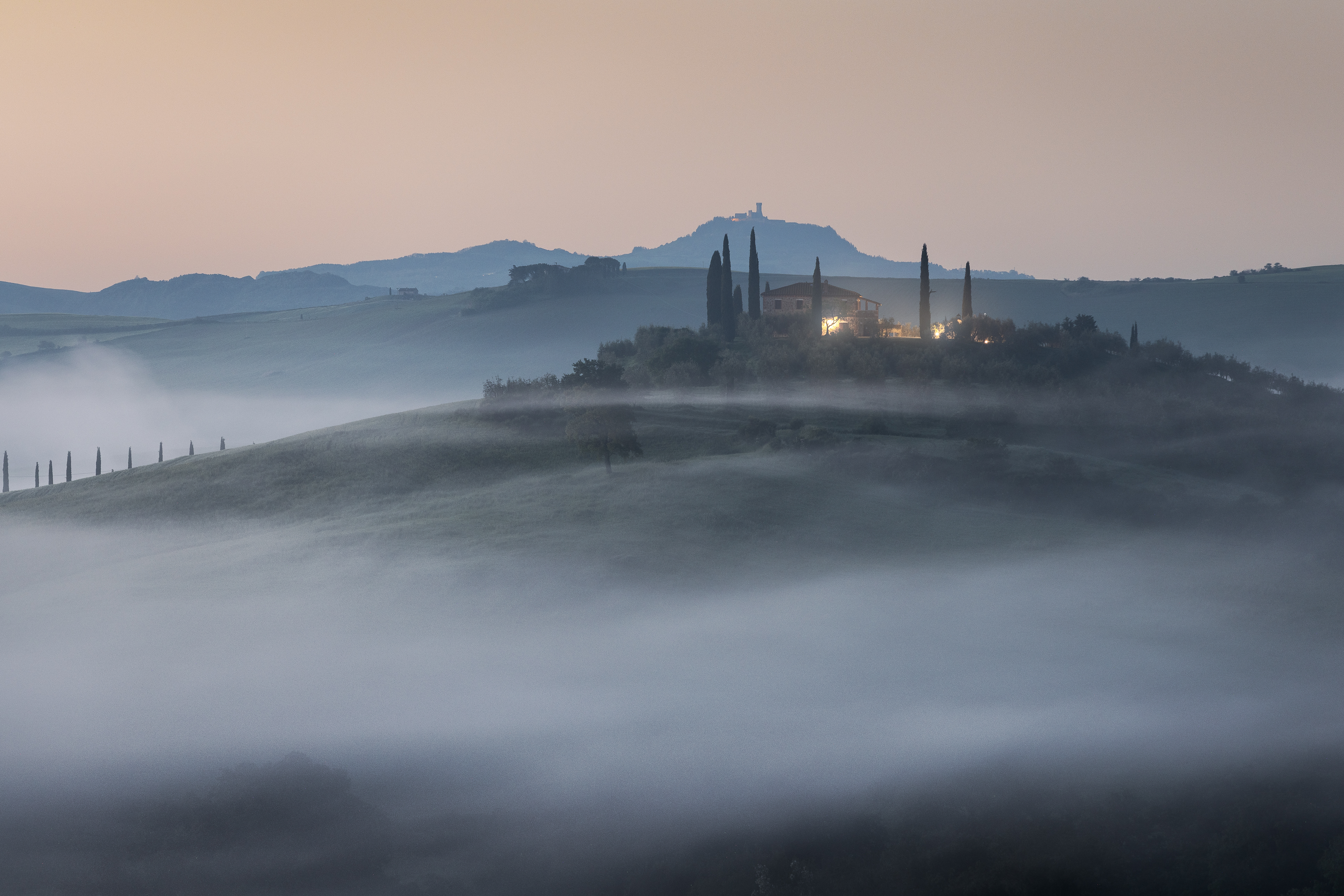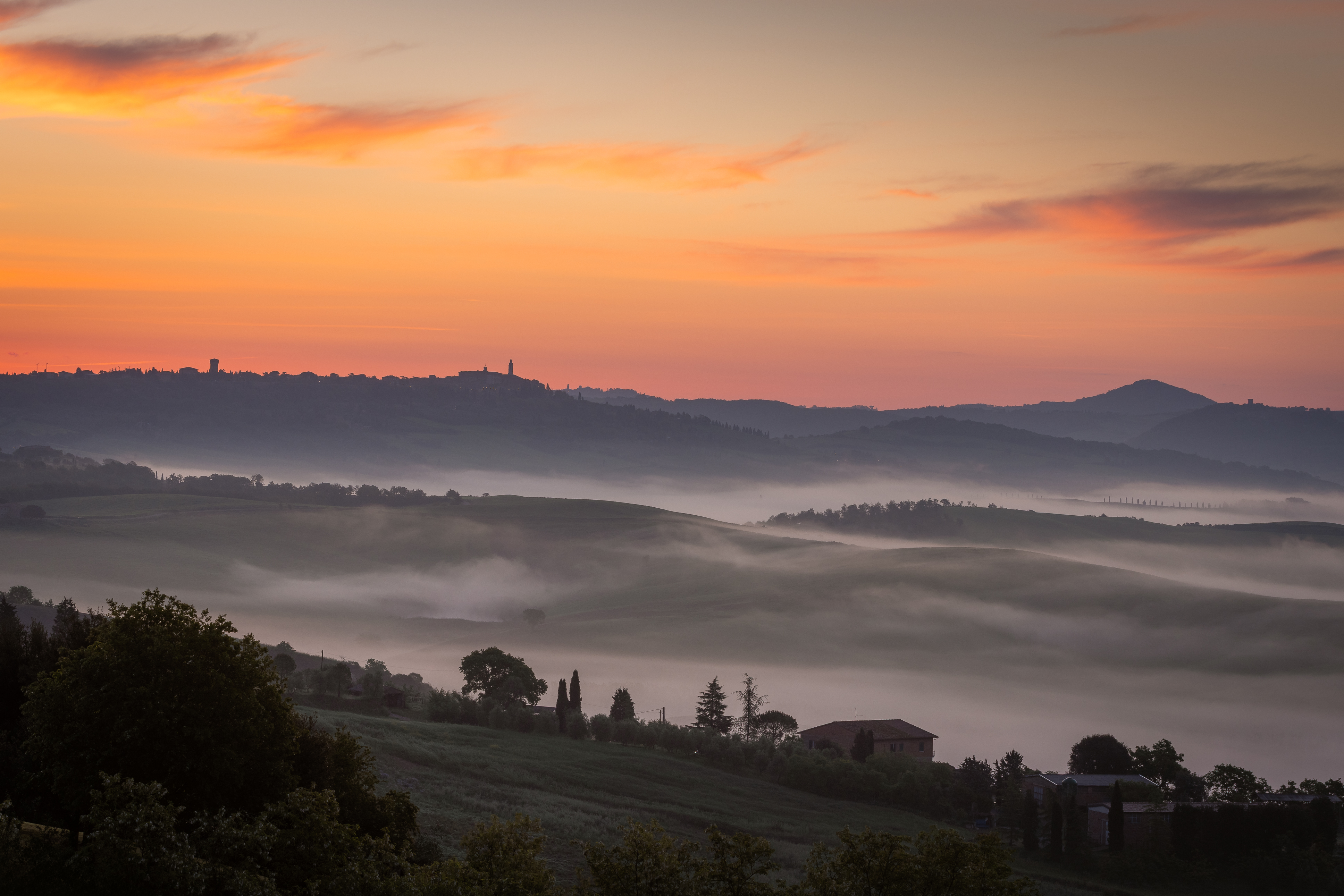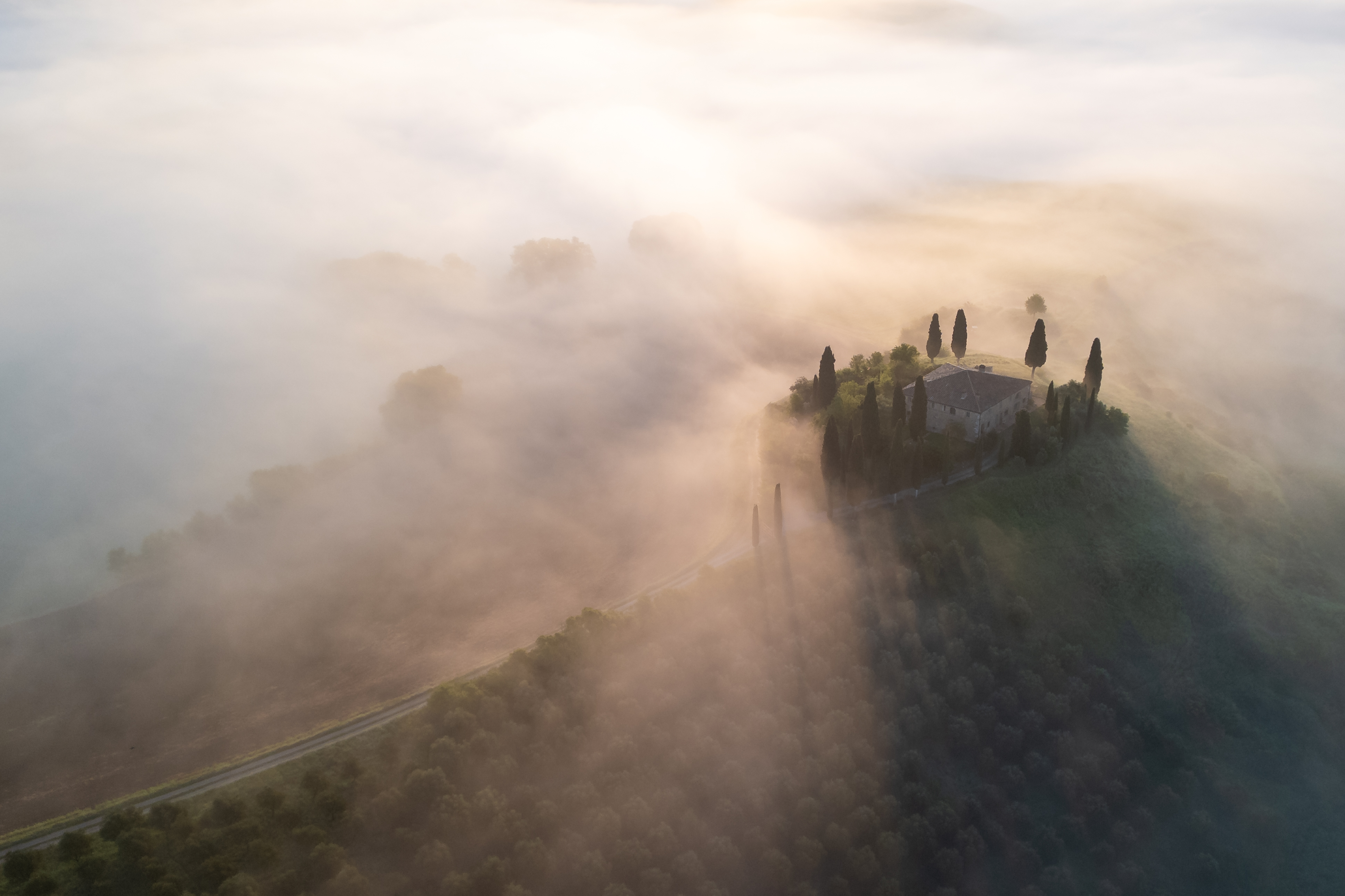 Alle 4:00 suona nuovamente la sveglia. Qui è un appuntamento fisso ormai. Mi dirigo a piedi verso la visuale di Poggiocovili dall’alto. Prima volta che scatto da qua. Il buio è avvolgente, e mi faccio strada con la mia torcia in testa sulla strada in salita. Stamani non sono solo. Sul posto c’è un fotografo che sta dormento in auto. Chiacchieriamo un po’, ed aspettiamo il sole assieme. Anche qua, la location è incredibilmente bella, d in poco tempo si riempie di altri fotografi. La nebbia avvolge copiosa il paesaggio anche stamattina. siamo stati davvero fortunati. Quando il sole sorge, la magia torna a dare spettacolo. giochi di luci ed ombre si snodano tra i filari dei cipressi del podere. Tutto è avvolto nella nebbia candida, eterea, accarezzata dai primi raggi del sole. Una sensazione meravigliosa.