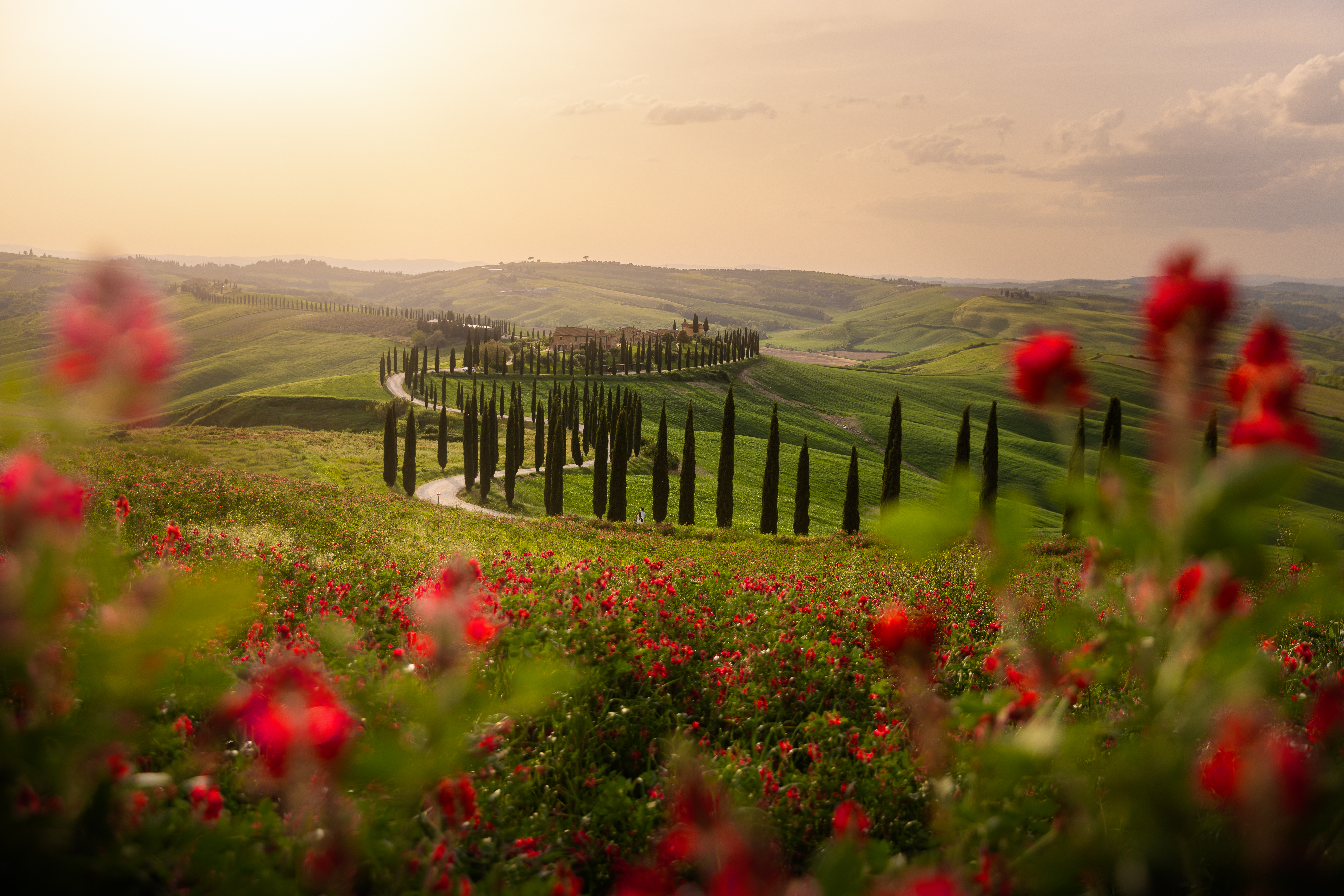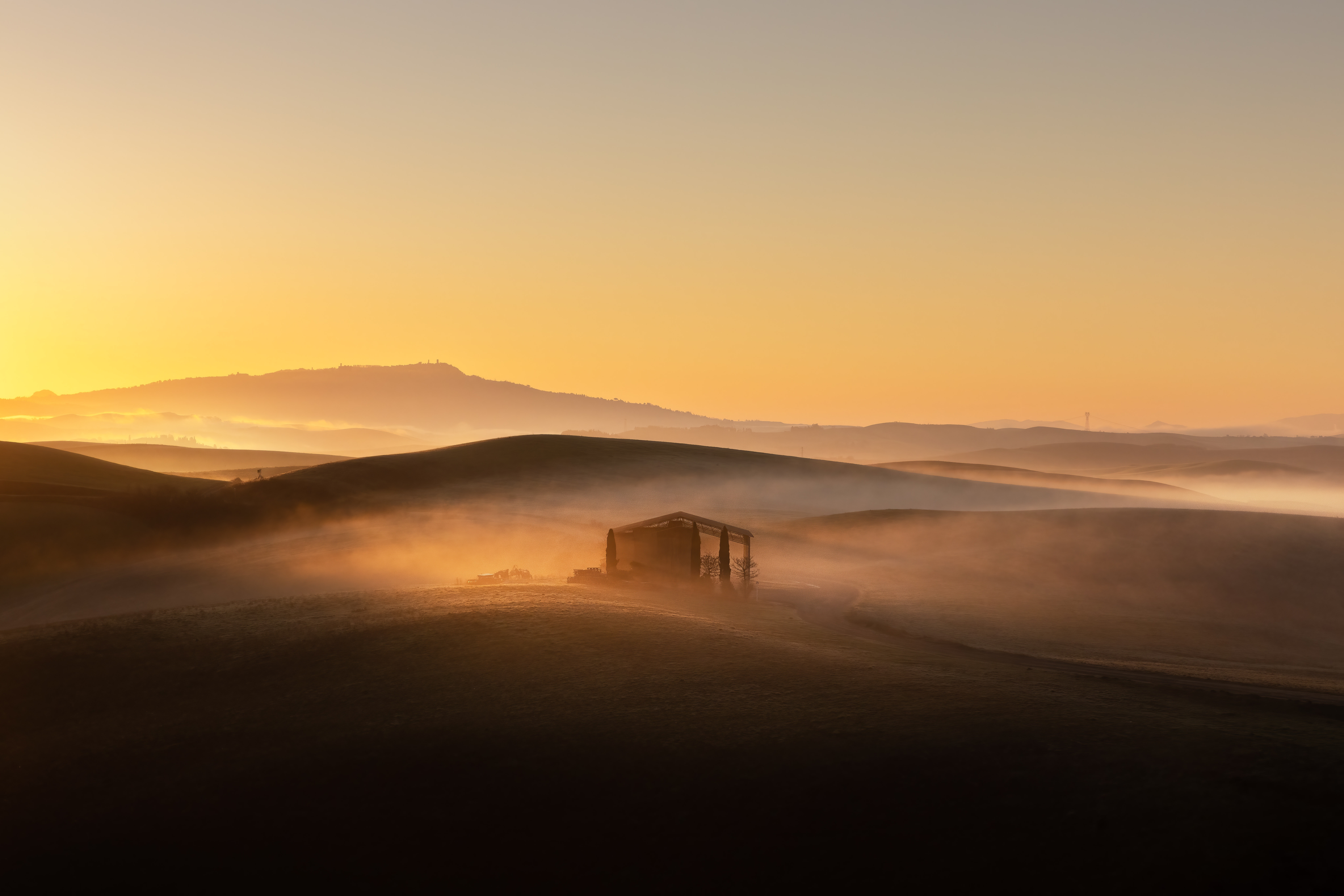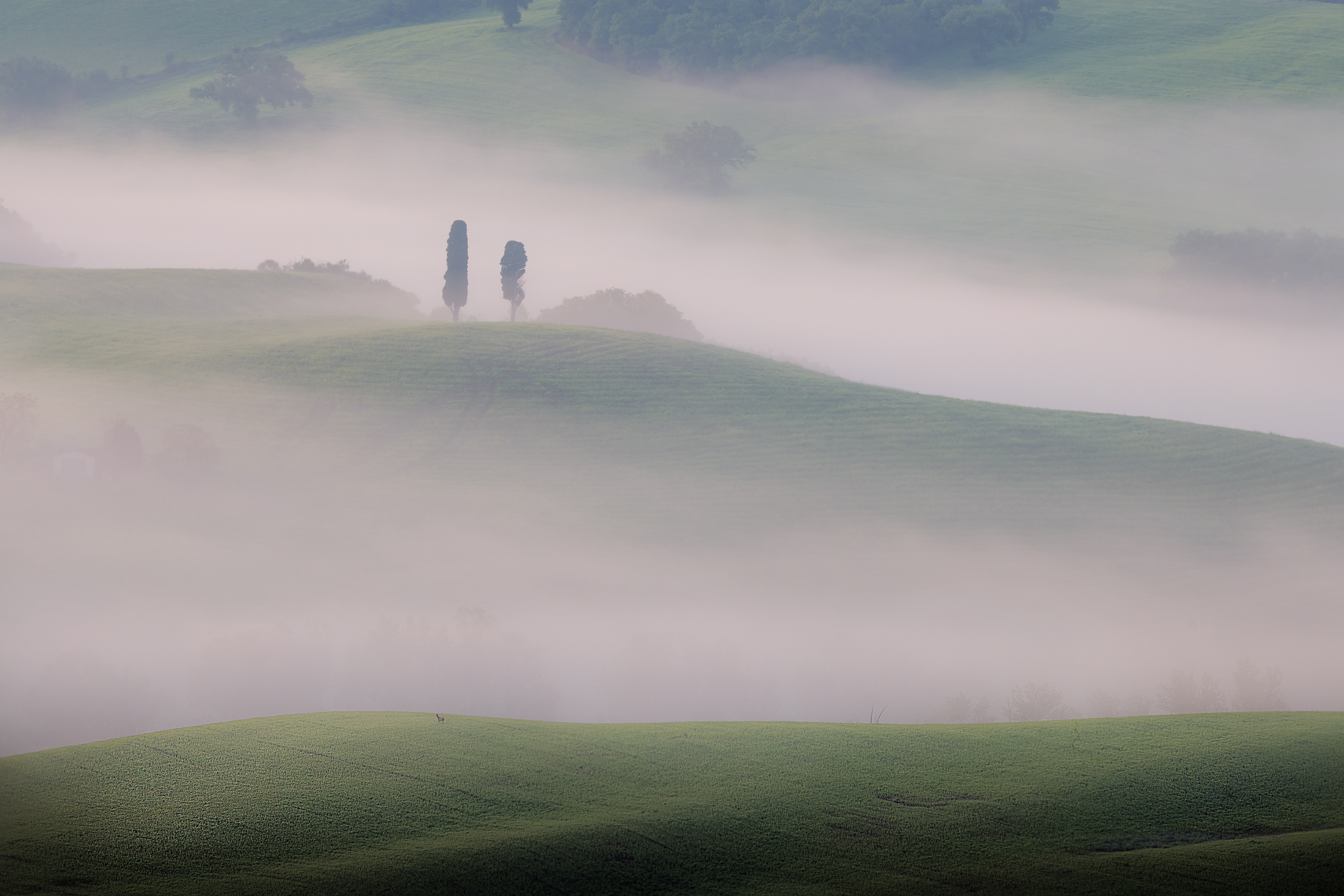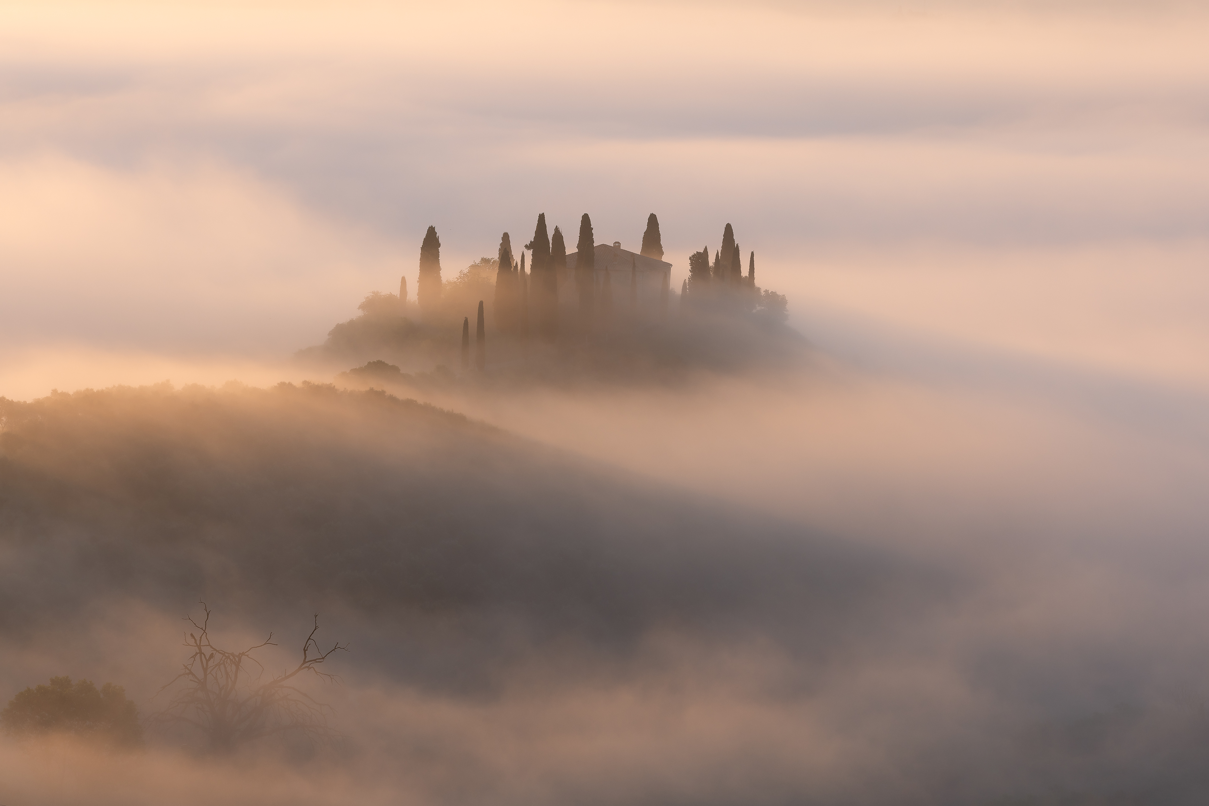 Alle 4:00 suona nuovamente la sveglia. Qui è un appuntamento fisso ormai. Mi dirigo a piedi verso la visuale di Poggiocovili dall’alto. Prima volta che scatto da qua. Il buio è avvolgente, e mi faccio strada con la mia torcia in testa sulla strada in salita. Stamani non sono solo. Sul posto c’è un fotografo che sta dormento in auto. Chiacchieriamo un po’, ed aspettiamo il sole assieme. Anche qua, la location è incredibilmente bella, d in poco tempo si riempie di altri fotografi. La nebbia avvolge copiosa il paesaggio anche stamattina. siamo stati davvero fortunati. Quando il sole sorge, la magia torna a dare spettacolo. giochi di luci ed ombre si snodano tra i filari dei cipressi del podere. Tutto è avvolto nella nebbia candida, eterea, accarezzata dai primi raggi del sole. Una sensazione meravigliosa.