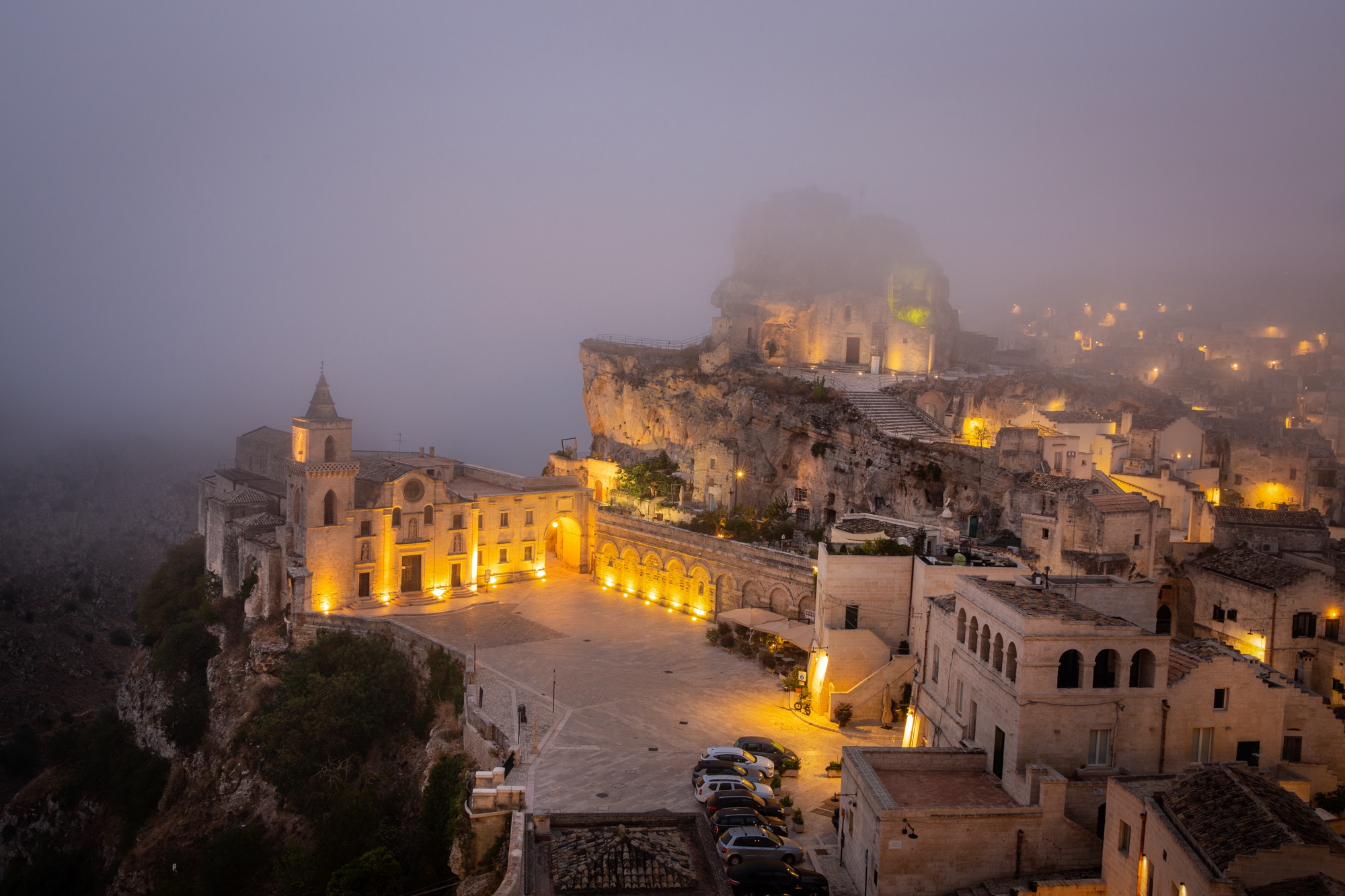 Drinnn… here we go. Still standing. This time the intention is to explore Sasso Caveoso, the oldest and most mysterious part of Matera. The focal point is undoubtedly the rock church of Santa Maria di Idris. It is a building carved into the rock, which stands in the upper part of Monterrone, a limestone cliff that dominates Sasso Caveoso. I wander around non-stop, looking for the most interesting point from which to shoot. I anxiously await the sunrise, which will illuminate this place. But today the weather gives me a huge gift: the fog!!! The first light of the sky is completely muffled. This whitish cloud makes everything so ethereal and so incredibly magical. I place all the tools of the trade. I have two cameras, and a video camera for a nice time-lapse. Even this morning I’m alone. Only later, a group of Japanese came alongside me, trying to copy my shots, intrigued by the cameras stationed there. What I have before me is difficult to explain. The fog comes and goes. It envelops everything and sometimes reveals some details, which emerge shyly before the eyes. When the sun rises on my left, the heat begins to dry the humidity in the air, lowering the wall of fog, which slowly vanishes like a dream, revealing the landscape under the soft rays of the sun, which illuminate the Sassi. An infinite wonder. I never even dreamed of finding these conditions. I feel truly blessed. I thank you and continue my tour, looking for the last glimpses before returning to base.