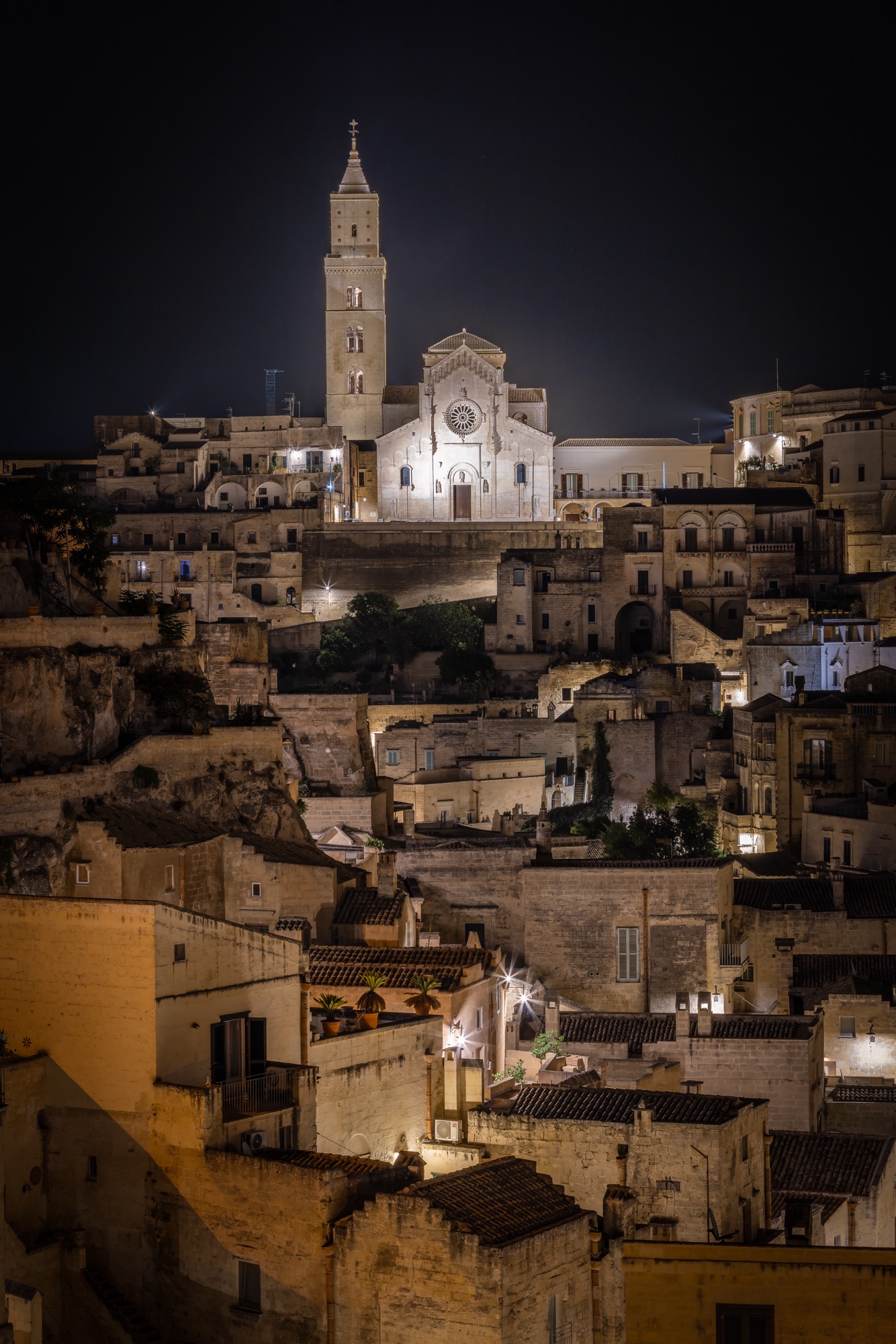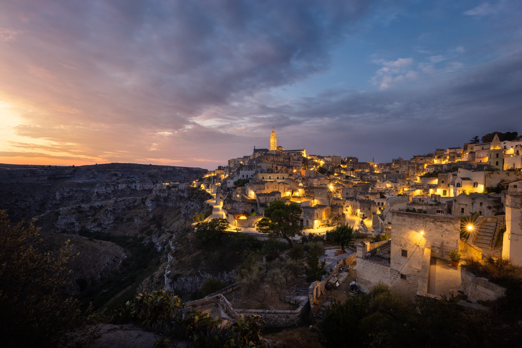 Around nine in the morning I decide to return to base. I’m ready to face the classic tourist day with my family. During the daytime, I take the opportunity to visit the city, the museums, the churches. I look for inspiration and new views to photograph during the night and the next morning. In the late afternoon we witness a memorable sunset. We are in the square in front of the cathedral. Looking west towards Sasso Barisano, the sky is tinged with a thousand colours. When the sun goes down, the lights of the houses come to life and face a new darkness, while, above the roofs, the sky literally catches fire. It’s a difficult emotion to describe. I was lucky to be able to capture this moment.