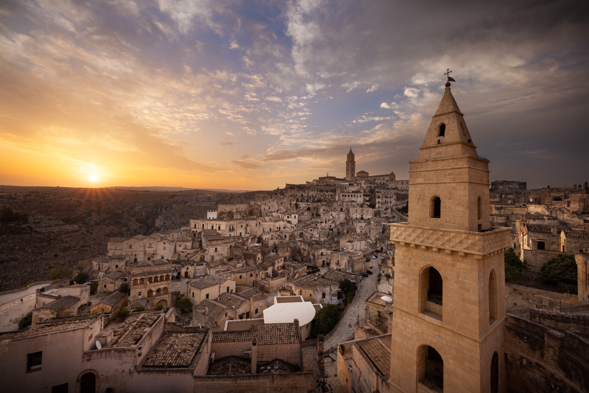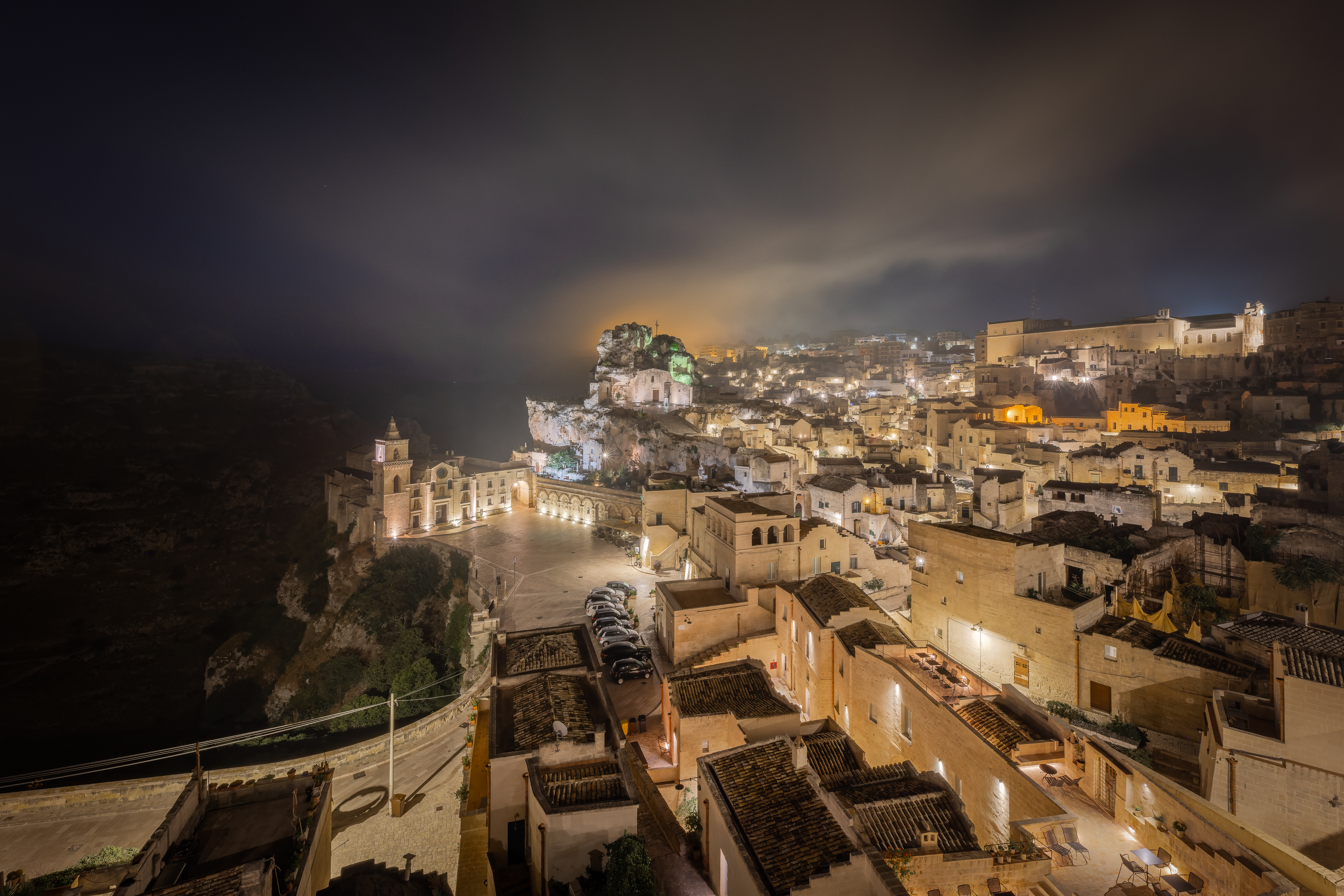 Intorno alle nove di mattina decido di rientrare alla base. Sono pronto ad affrontare la classica giornata da turista con la famiglia. Durante le ore diurne, ne approfitto per visitare la città, i musei, le chiese. Cerco ispirazione e nuovi scorci da fotografare durante la notte e la mattina successiva. Nel tardo pomeriggio assistiamo ad un tramonto memorabile. Ci troviamo nella piazza di fronte alla cattedrale. Guardando ad ovest verso il Sasso Barisano, il cielo si tinge di mille colori. Quando il sole va giù, le luci delle case prendono vita ed affrontano una nuova oscurità, mentre, sopra i tetti, il cielo prende letteralmente fuoco. È un’emozione difficile da descrivere. Sono stato fortunato a poter immortalare questo momento.
