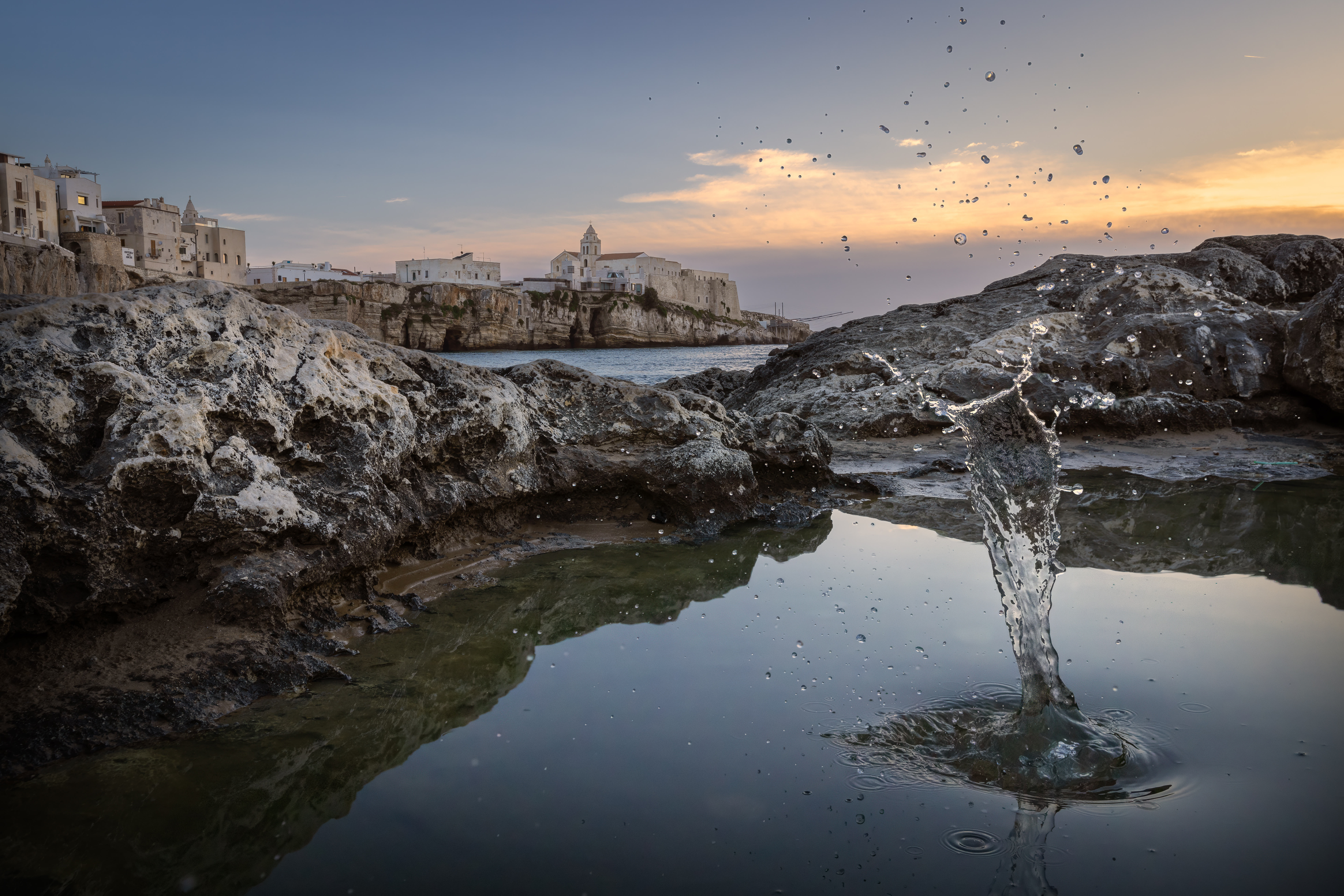 Il mio tour fotografico è iniziato nel cuore di Vieste, il borgo antico. Le strette vie lastricate, le case bianche e le botteghe artigiane sono il riflesso della tradizione e della storia secolare di questa cittadina. Ho catturato scatti unici della Cattedrale di Santa Maria Assunta, che con il suo campanile svetta sul centro storico, e del Castello Svevo, che domina il paese con la sua imponente presenza e regala una vista straordinaria sul mare Adriatico. Le prime luci del mattino, quando il sole si riflette sulle mura antiche, creano un’atmosfera quasi surreale, perfetta per chi cerca immagini autentiche.