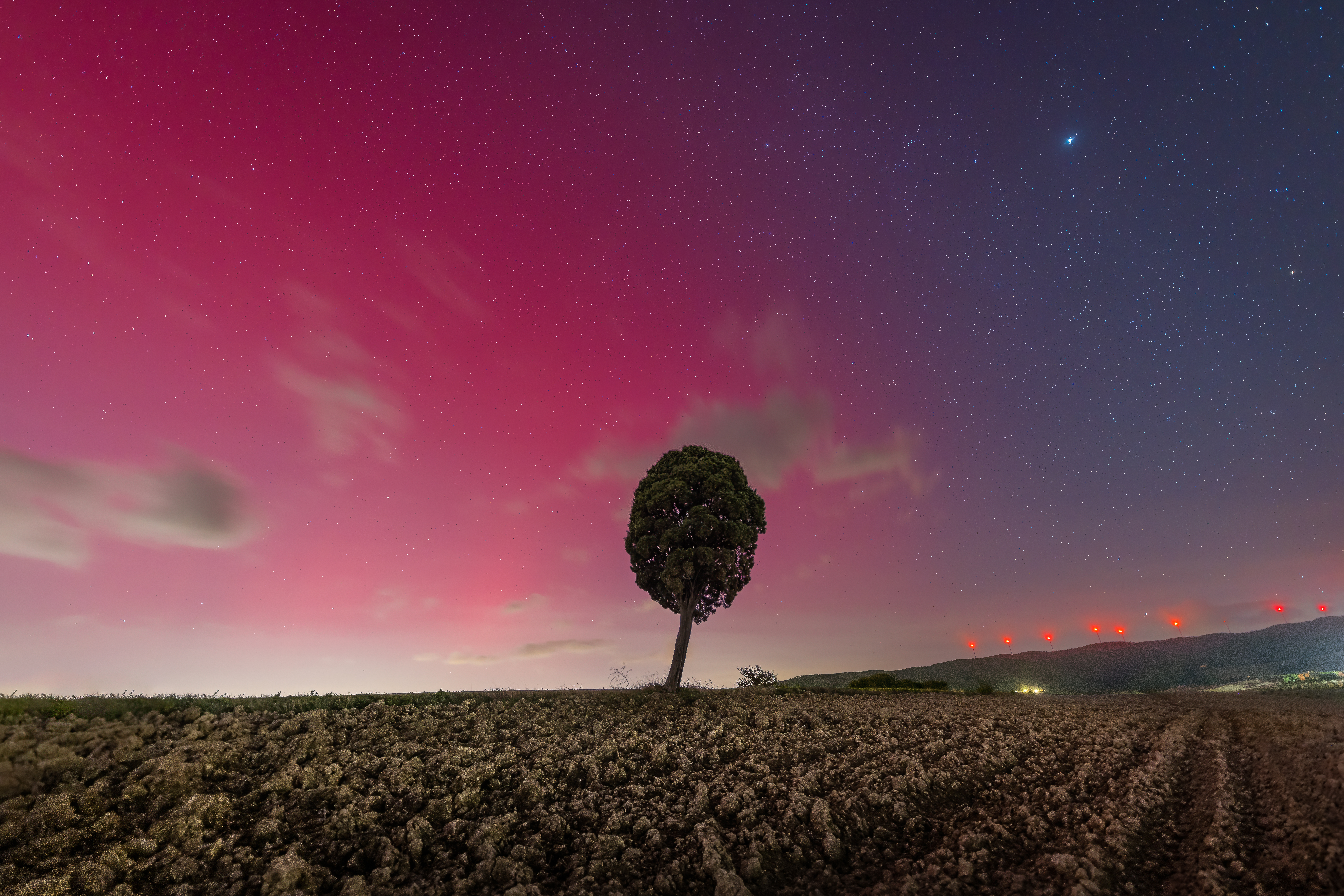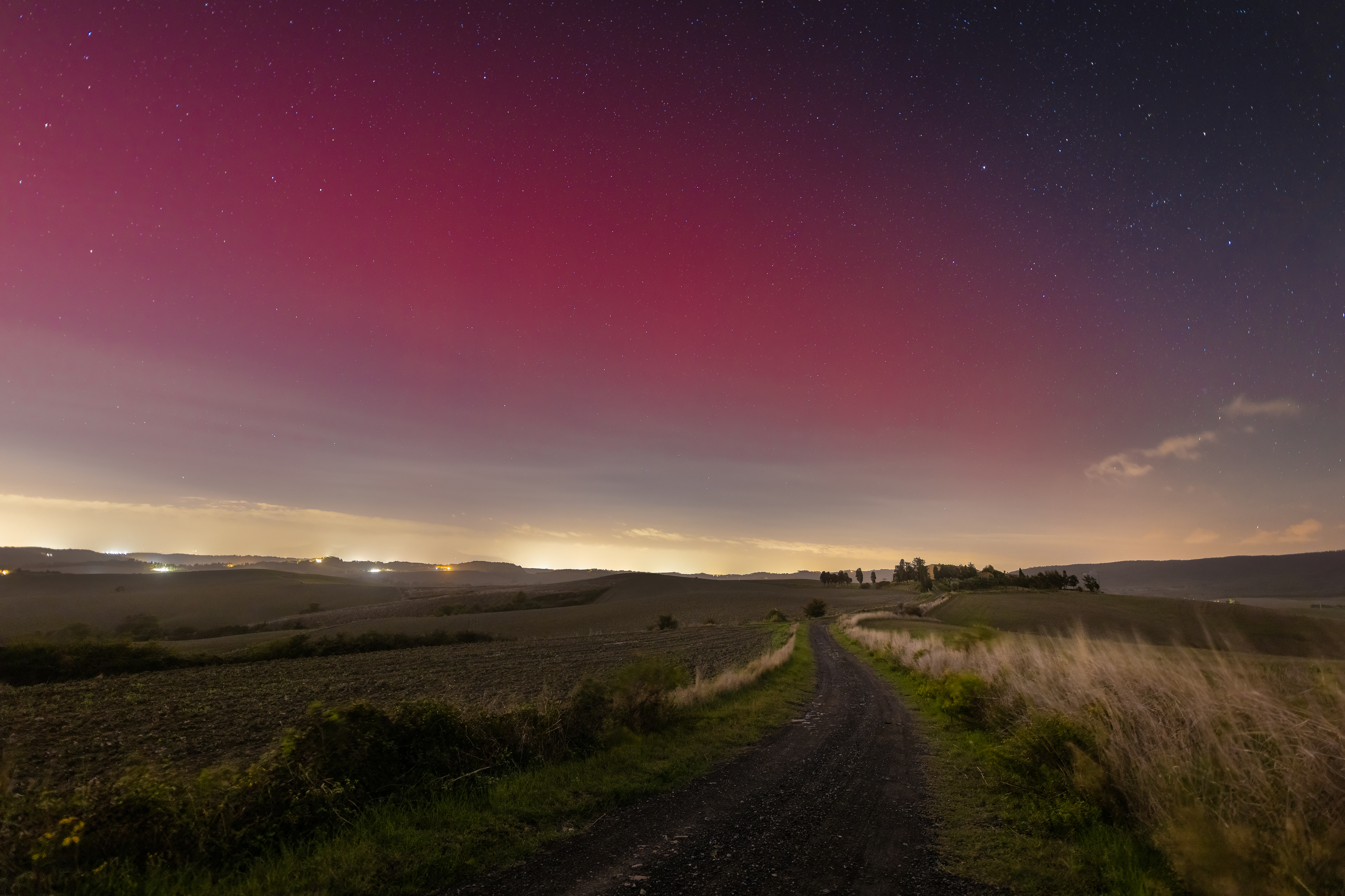 Who would have thought? The Aurora Borealis, a typical phenomenon of the Northern skies, has reached our little corner of Tuscany. Actually, to be correct, the phenomenon is called SAR. The Aurora Borealis and the SAR (Stable Auroral Red Arc) are both luminous phenomena in the Earth’s atmosphere, but they differ in origin and appearance: the aurora is more spectacular and dynamic, with many dancing green and pink shades. The SAR is a rarer, more stable phenomenon in the sky, which manifests itself as a bright red/pink arc. This rare event was the result of a particularly intense solar storm, which allowed this phenomenon to occur much further south than usual.