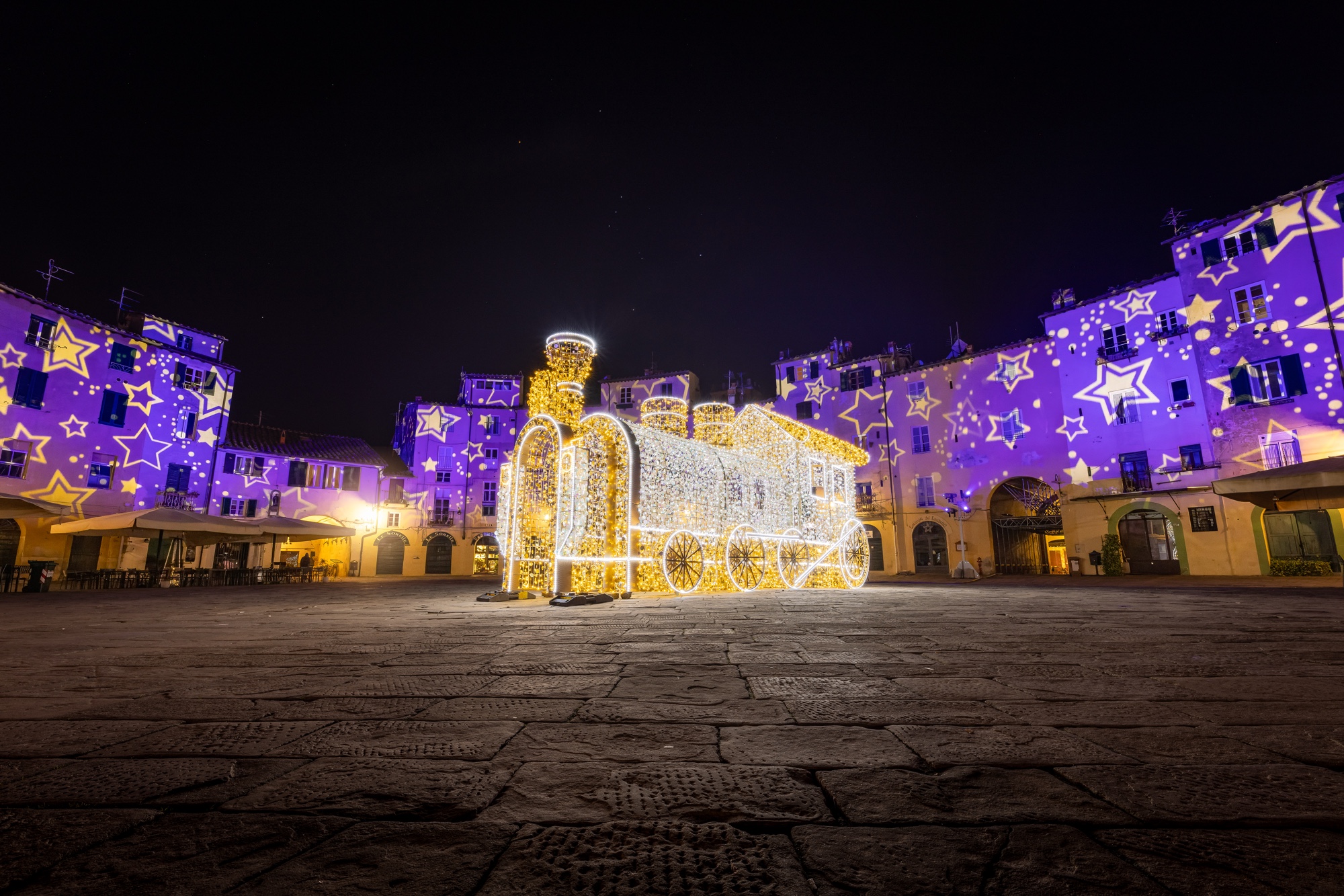 The amphitheater could not be missed, with its fantastic illuminated train, a favorite meeting point for children. The houses all around light up festively, with a series of stars that, moving gently, caress the walls and windows. A riot of colors and celebration.