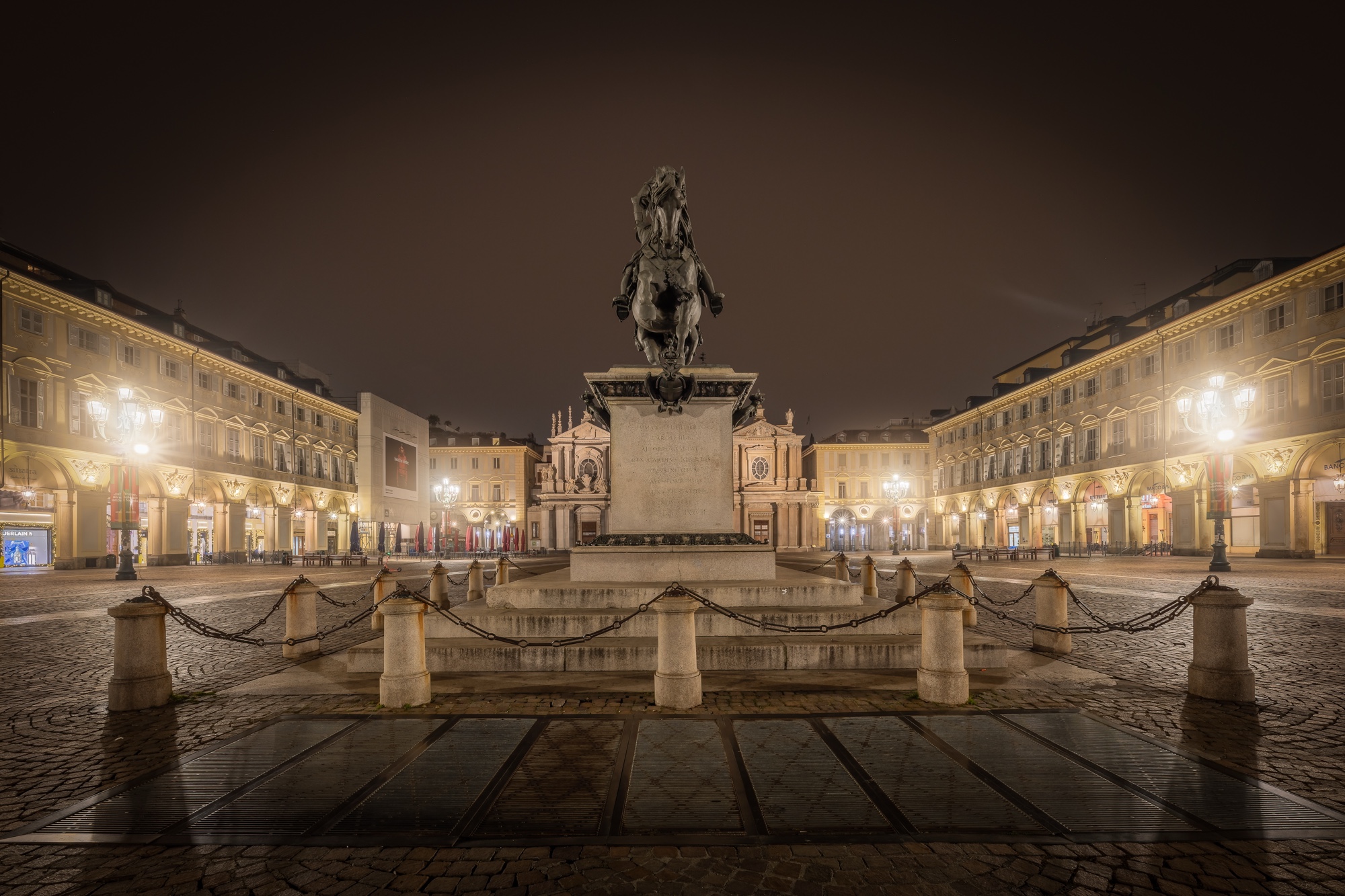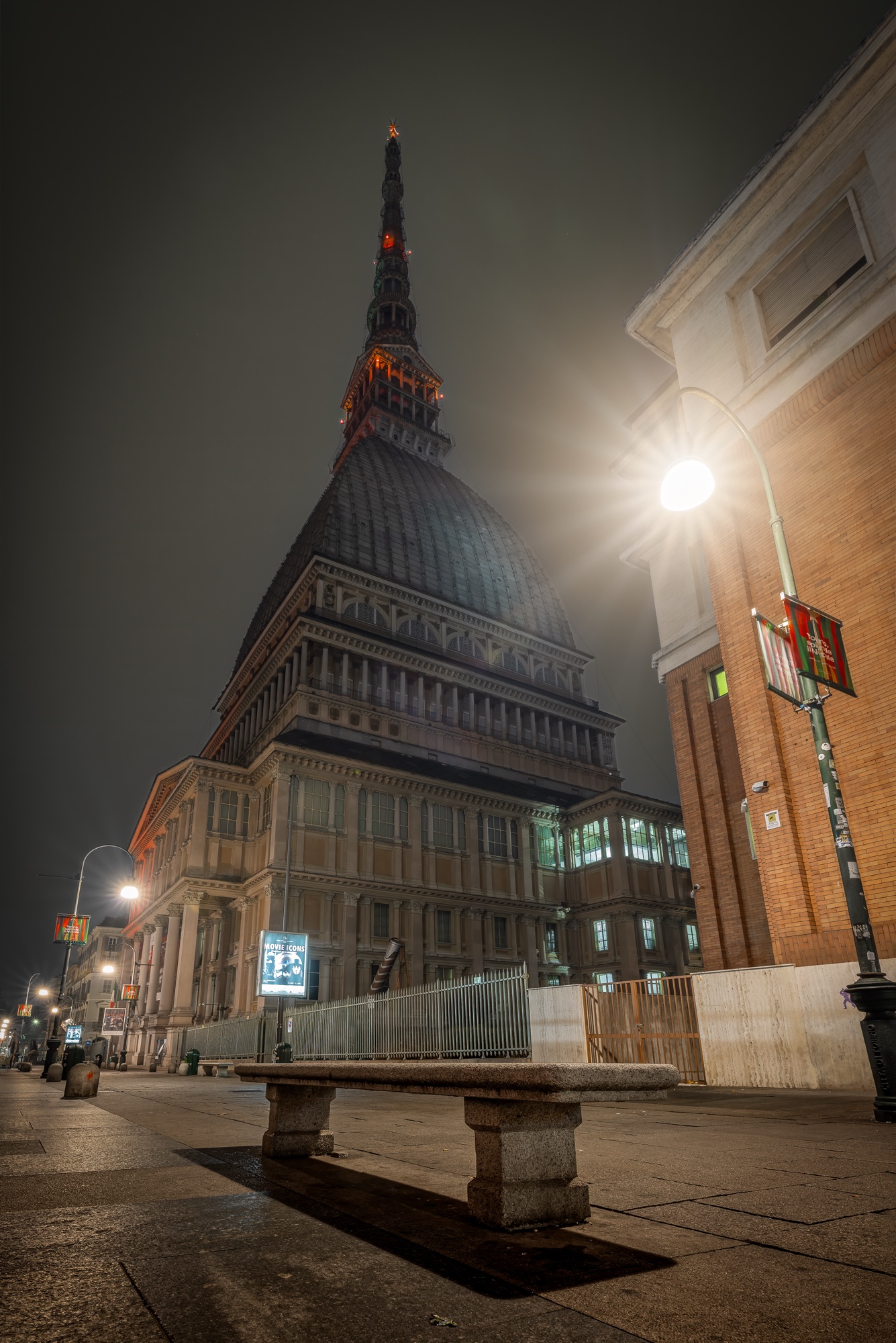 I took several photos of the Mole Antonelliana, which seemed to vanish into thin air, and of the silent streets, where the lights of the street lamps reflected on the wet cobblestones.