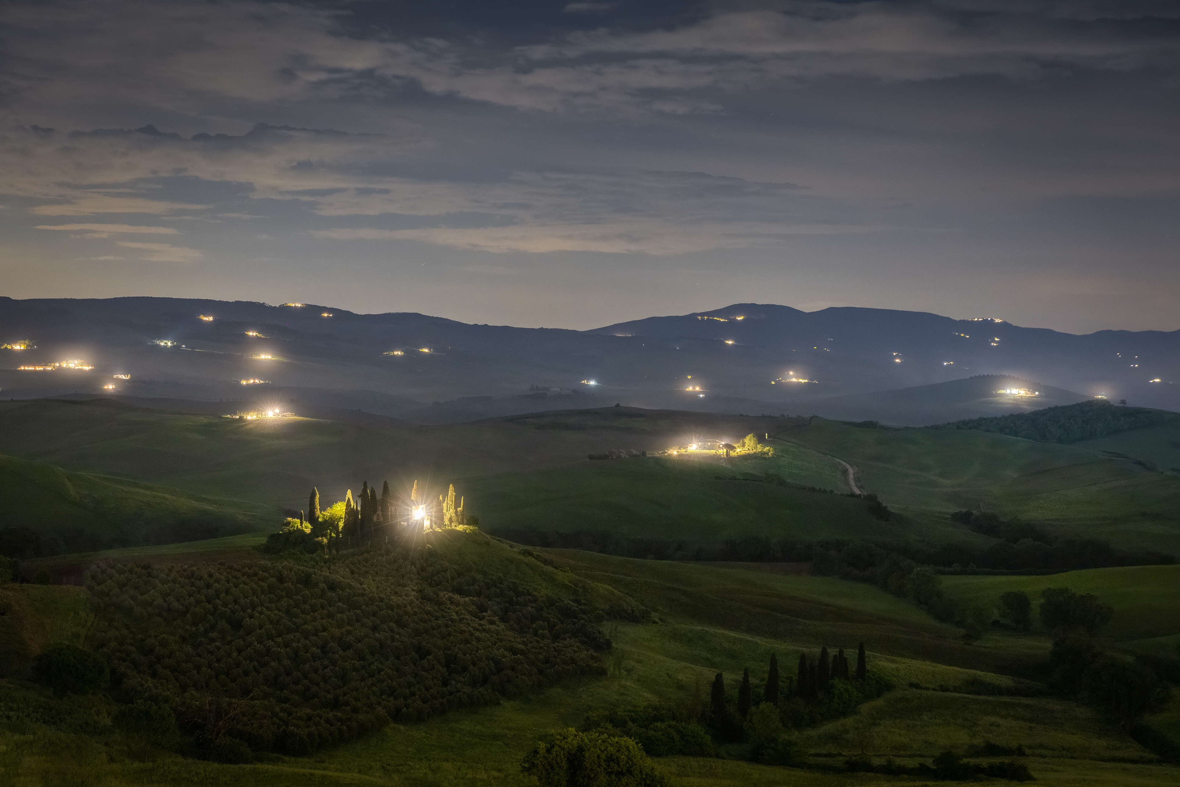 Ore 01:00. Mi alzo per la prima foto in notturna a Podere Belvedere. Sono solo. Il silenzio è assordante. L’erba mi inzuppa completamente i pantaloni. Ha smesso di piovere giusto da un paio d’ore, ed il cielo ha già aperto a interessanti trame di nuvole e stelle. Faccio qualche scatto e torno a dormire qualche ora, per svegliarmi prima che sorga il sole.