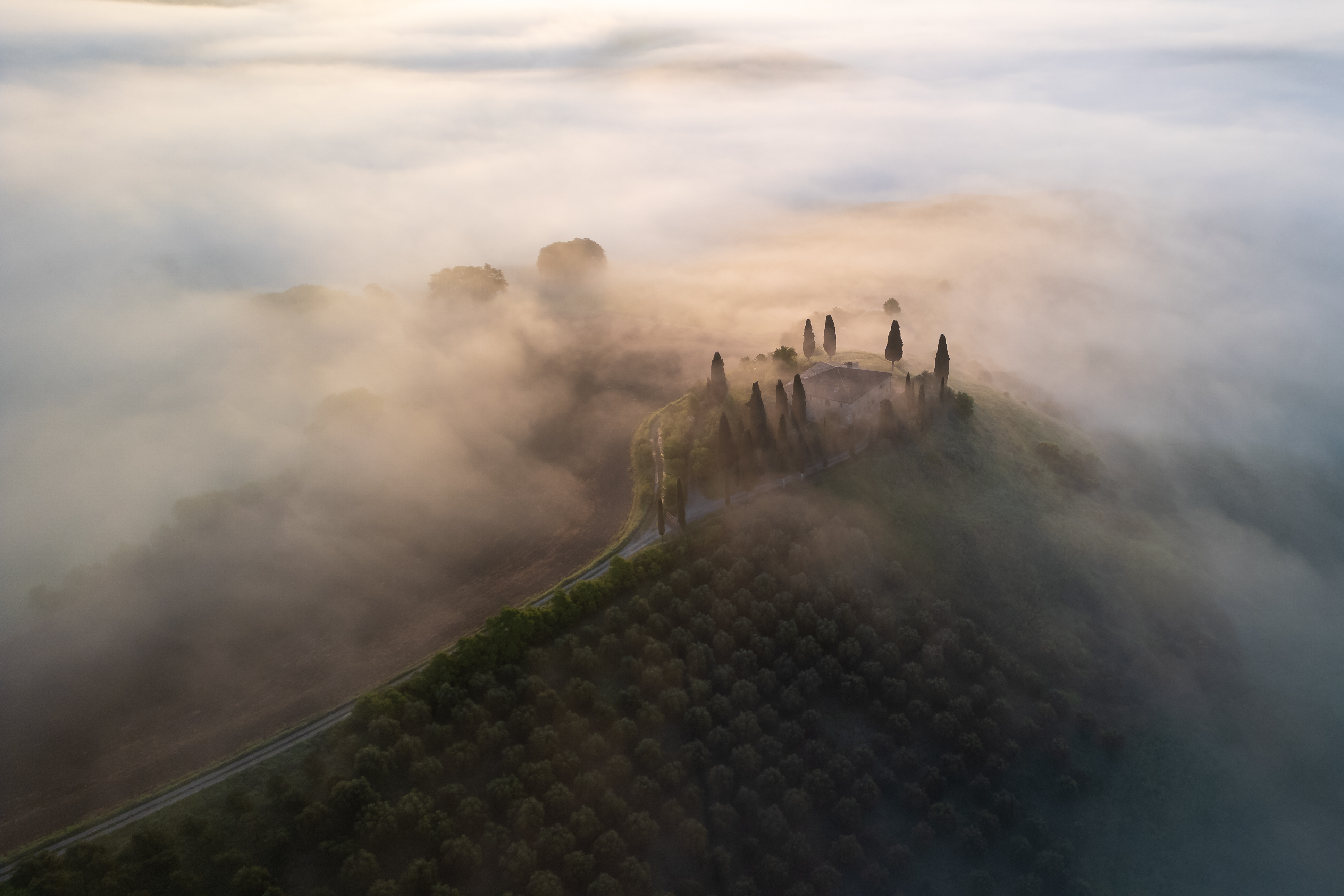 Il podere comincia a spuntare lentamente dalla coltre di nebbia sotto di noi. Una visione letteralmente stupefacente. La meraviglia della natura in tutto il suo splendore. Mi sposto, alzo anch’io il drone in cerca di una diversa visuale. Volare qui è una sensazione incredibile. Magia e libertà.