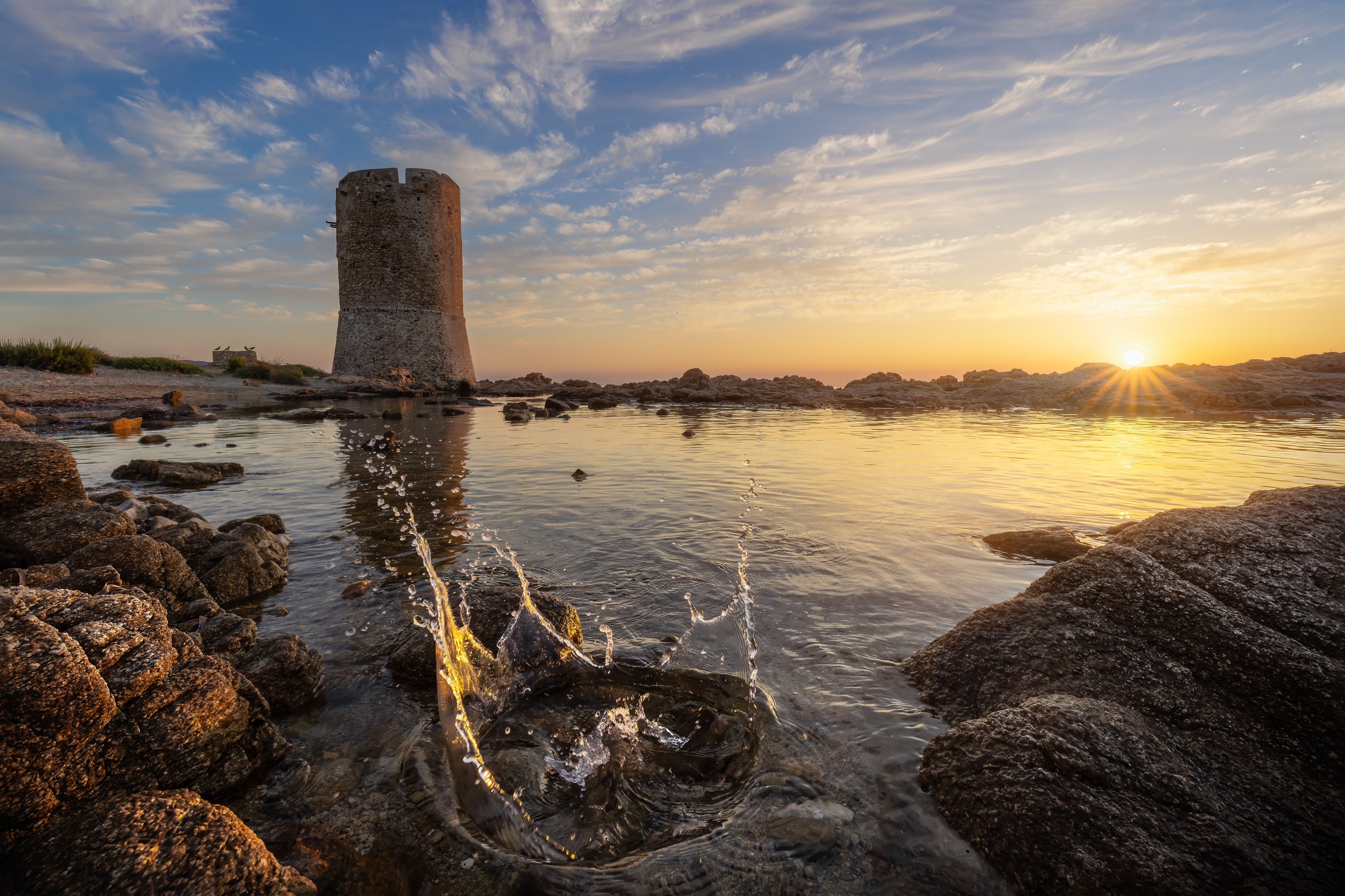 Ma è nei luoghi di pietra e storia che le emozioni si sono fatte più intense. Il Faro di Capo Comino e la torretta costiera di La Caletta sono stati scenari perfetti per i miei scatti. Il faro, simbolo di guida e resilienza, si accendeva con la luce dorata, un faro terreno illuminato da un faro celeste. Qui, ho potuto sentire la storia e la solitudine del luogo, un’emozione che ho cercato di trasmettere attraverso lunghe esposizioni che addolcivano il movimento del mare intorno alla roccia millenaria.