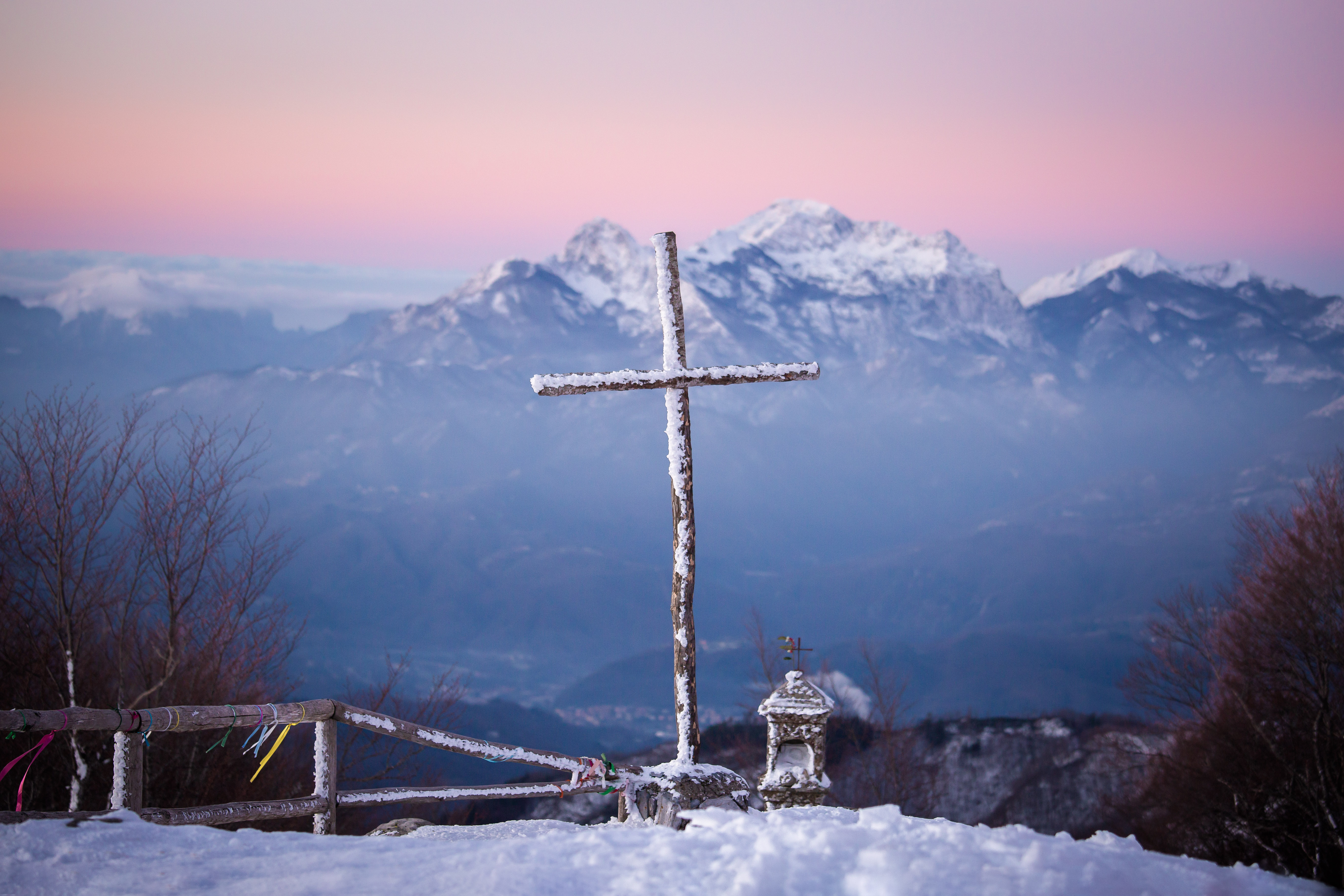 Entriamo nel santuario, e appena ci affacciamo alla terrazza un mondo incredibile si svela ai nostri occhi. La neve illuminata dagli ultimi attimi della notte camicia a svelarsi tutto attorno a noi. La temperatura è perfetta: 0° senza un minimo di umidità. Si sta d’incanto.