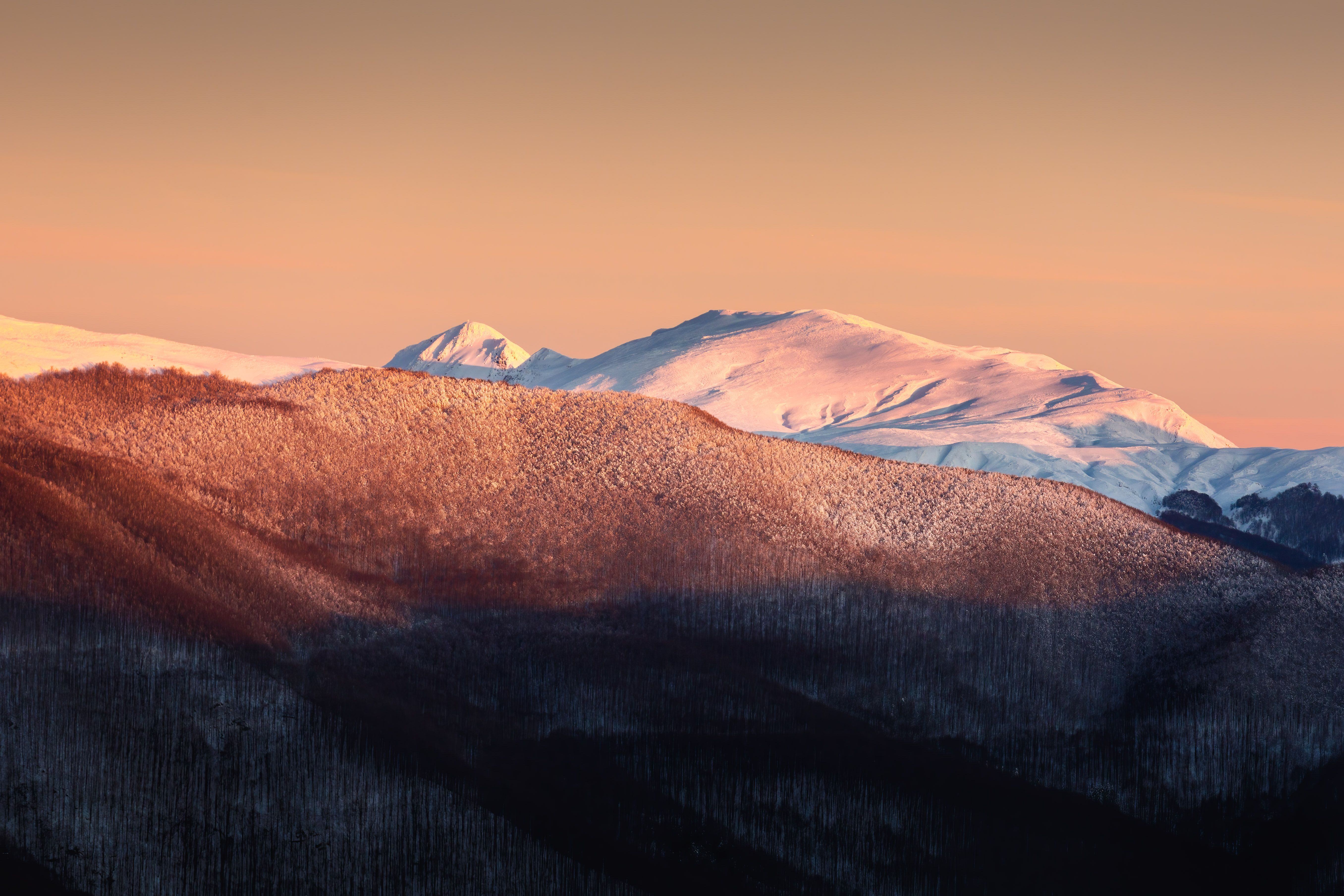 Cominciamo a fare i primi scatti. Monto un teleobiettivo, un 150-600, per immortalare le montagne in lontananza. La vastità del paesaggio che ci circonda rivela i massicci delle Apuane. Si vede la Pania, il Pisanino, il Pizzo d’Uccello. Il cielo man mano si colora. I colori passano dal blu al viola, e poi al rosa intenso. I primi raggi del sole illuminano la neve sui picchi più alti. Luci ed ombre danzano creando forme e colori in continuo movimento. Che spettacolo.