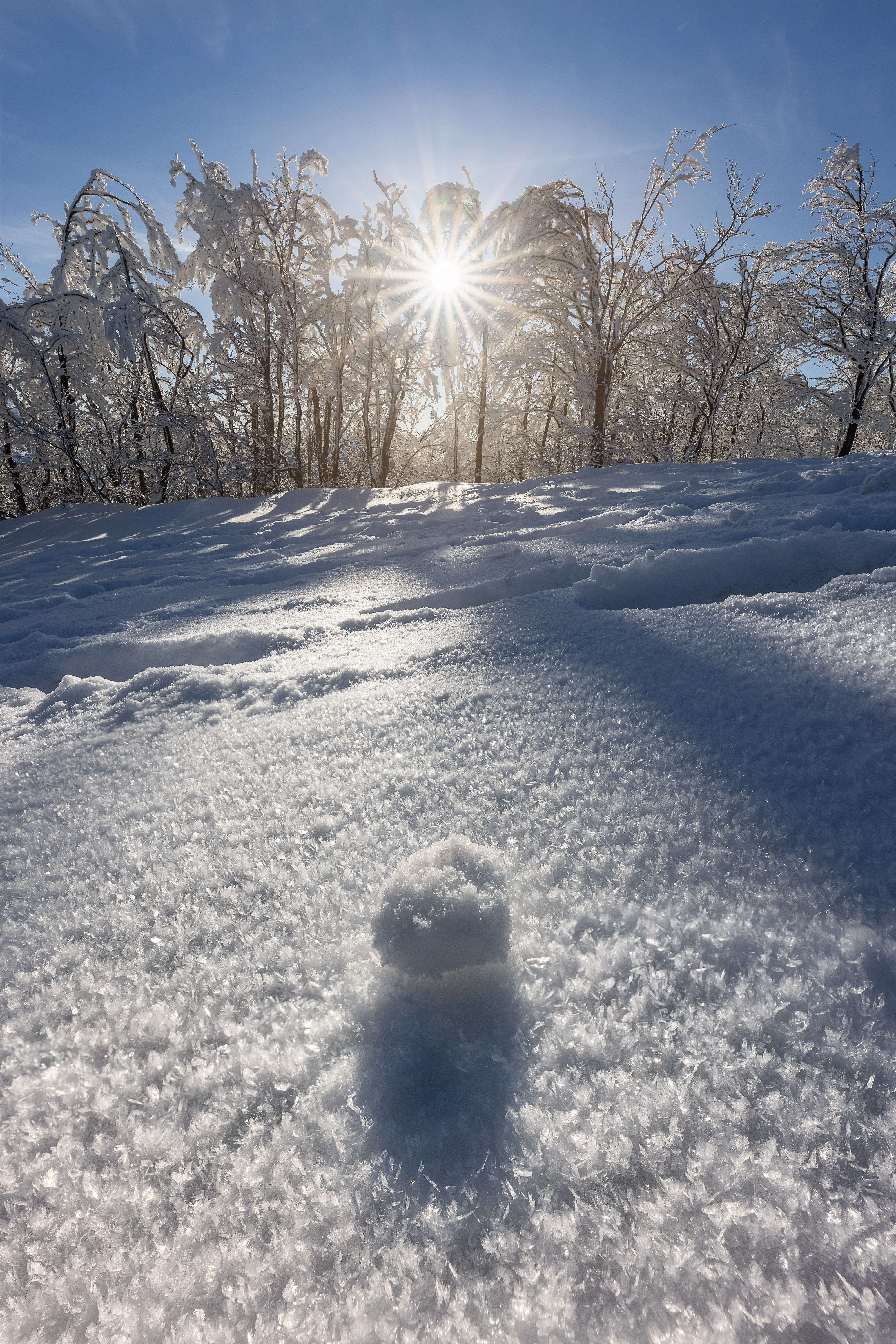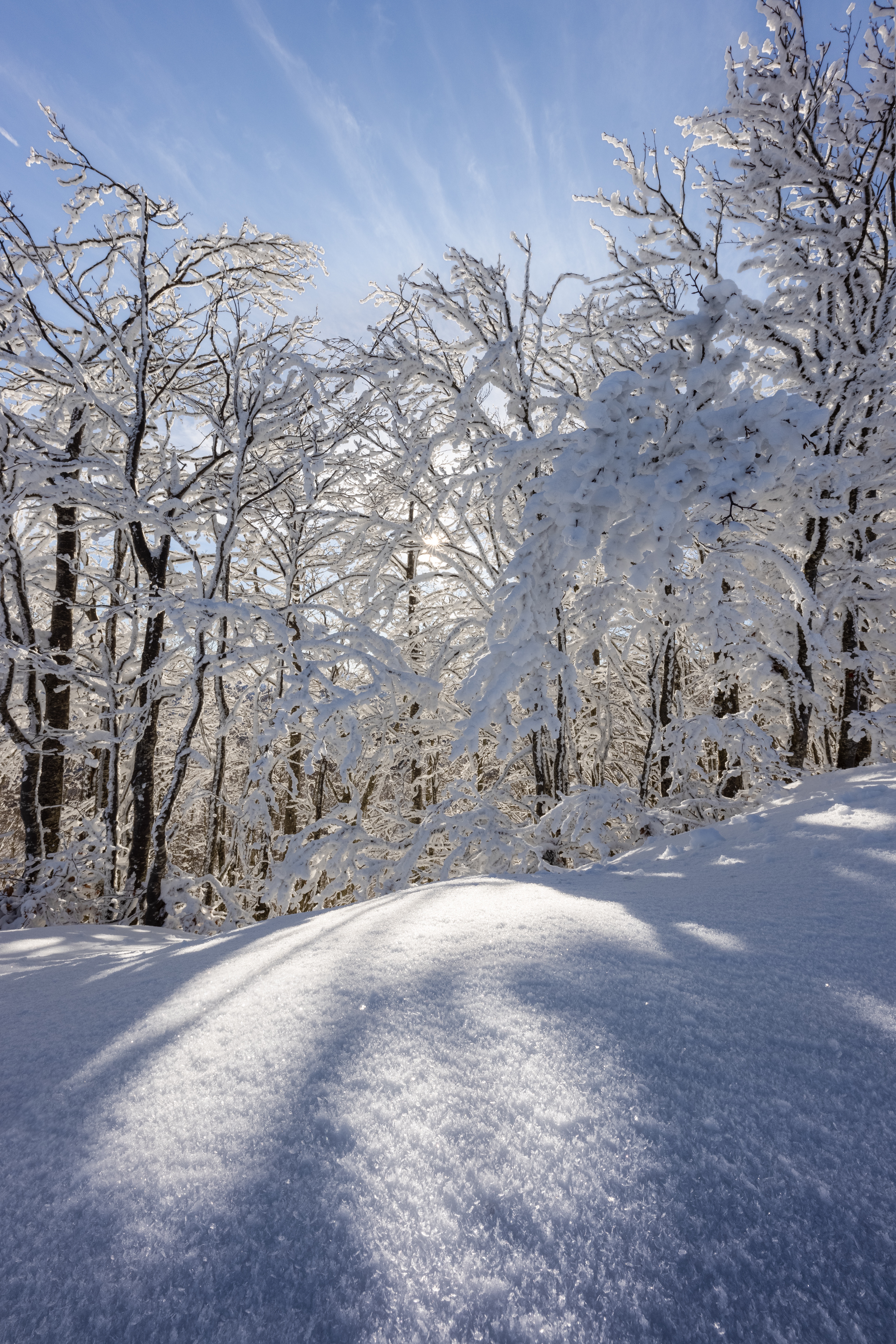 We move towards Passo delle Radici. The snow on the trees is magnificent: thanks to the perfect temperature, it sticks to the branches and creates a magical atmosphere. We also take pictures here. There are hints everywhere. The texture of the snow draws irregular plots which, thanks to the light that filters through the branches of the trees, seem to observe an abstract painting.