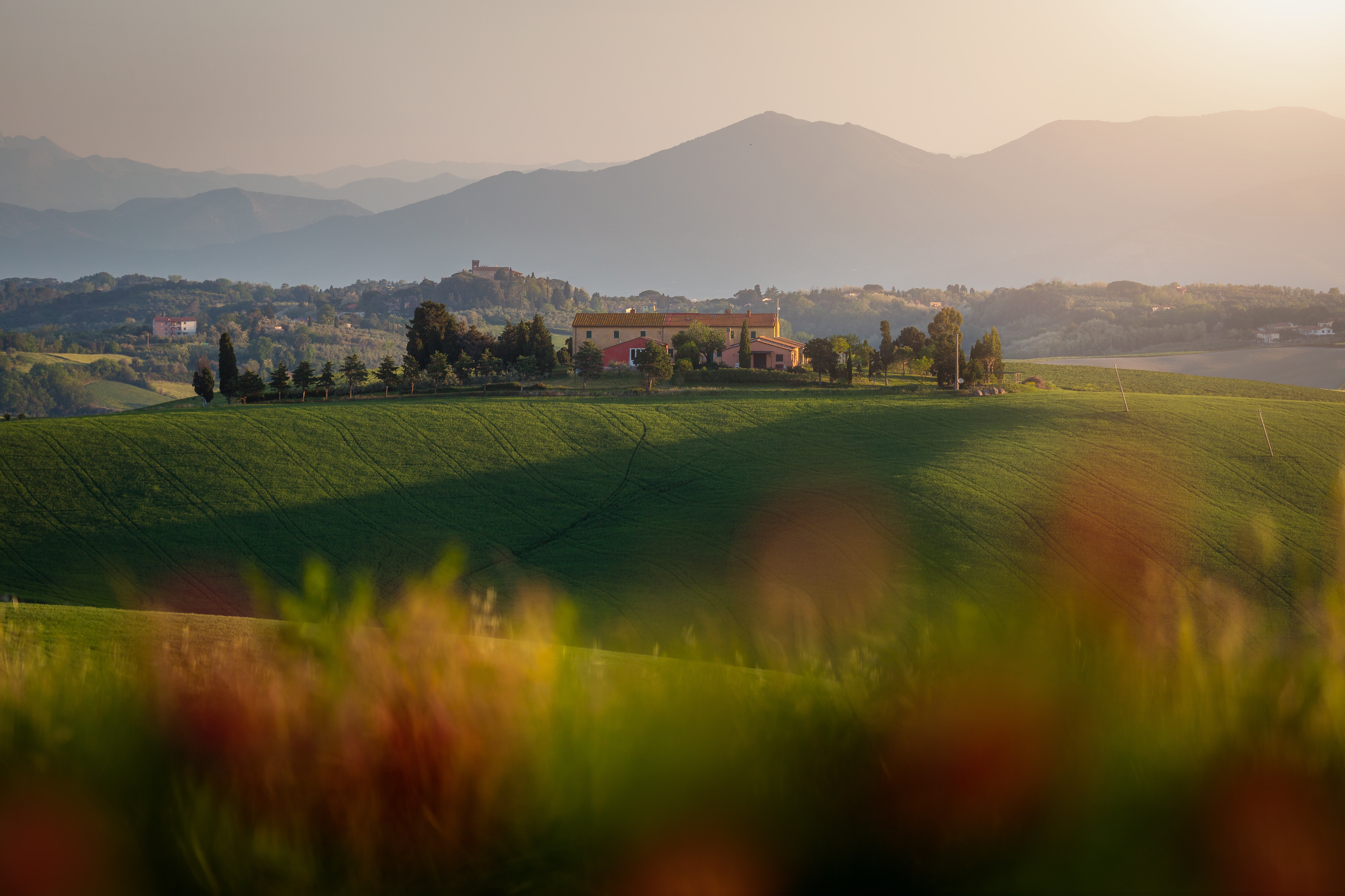 Terra pura e genuina. I verdi dei vasti prati; i gialli dei fiori; marroni e ocra della terra, continuamente bagnata dalle piogge autunnali e asciugata dalle fresche giornate primaverili, in cui il sole fa capolino tra un colle e l’altro. L’azzurro del cielo si alterna a fitte nubi che prendono il colore del sole del nuovo giorno.